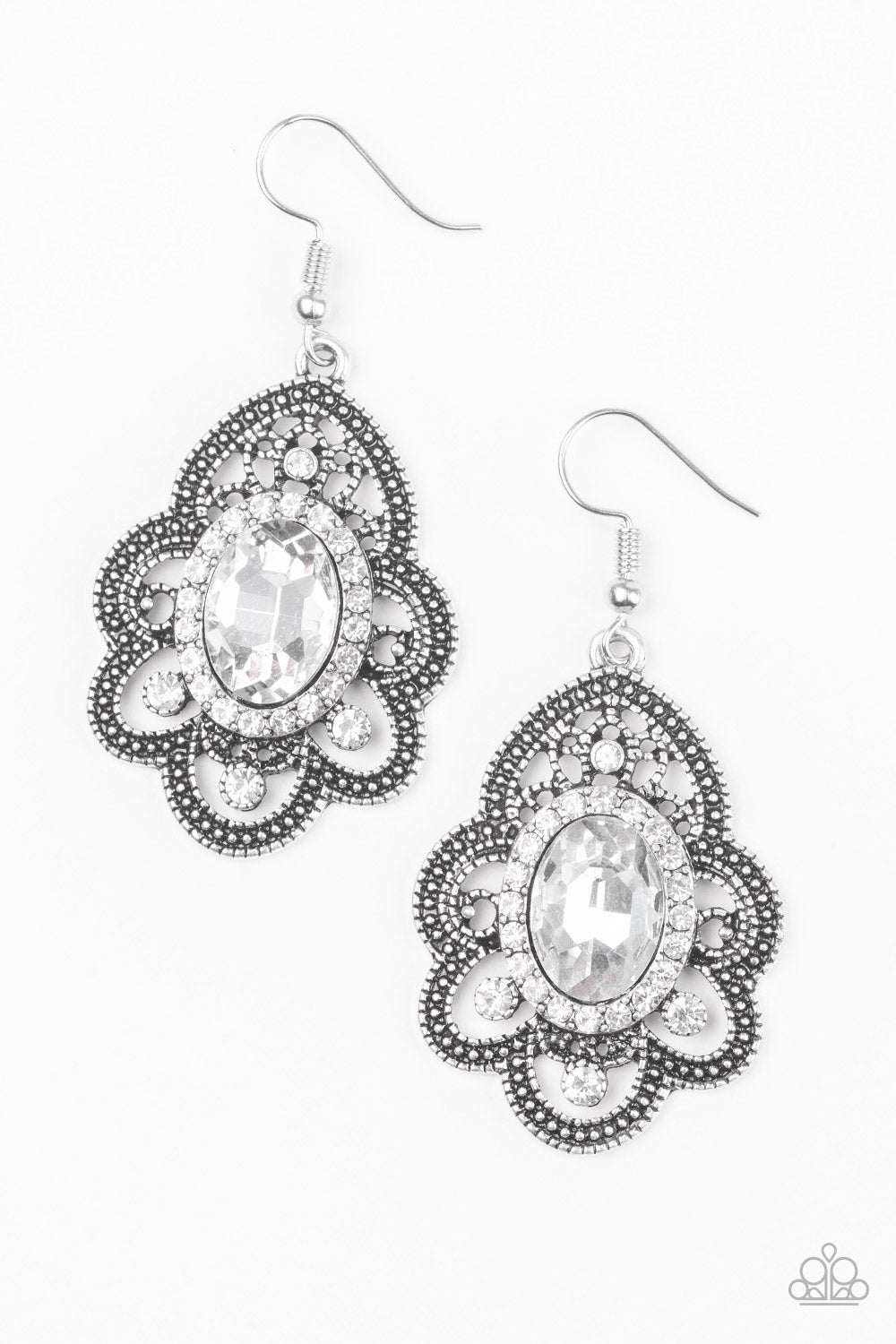 Radiating with studded detail, antiqued silver petals flare from a white rhinestone encrusted center for a regal look. Earring attaches to a standard fishhook fitting.