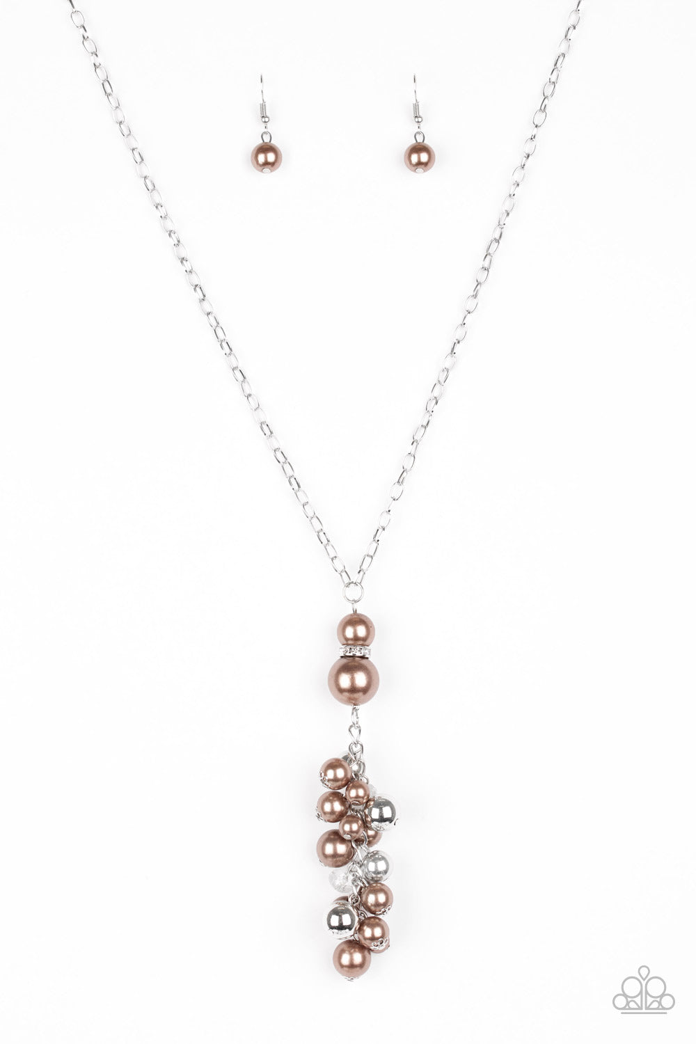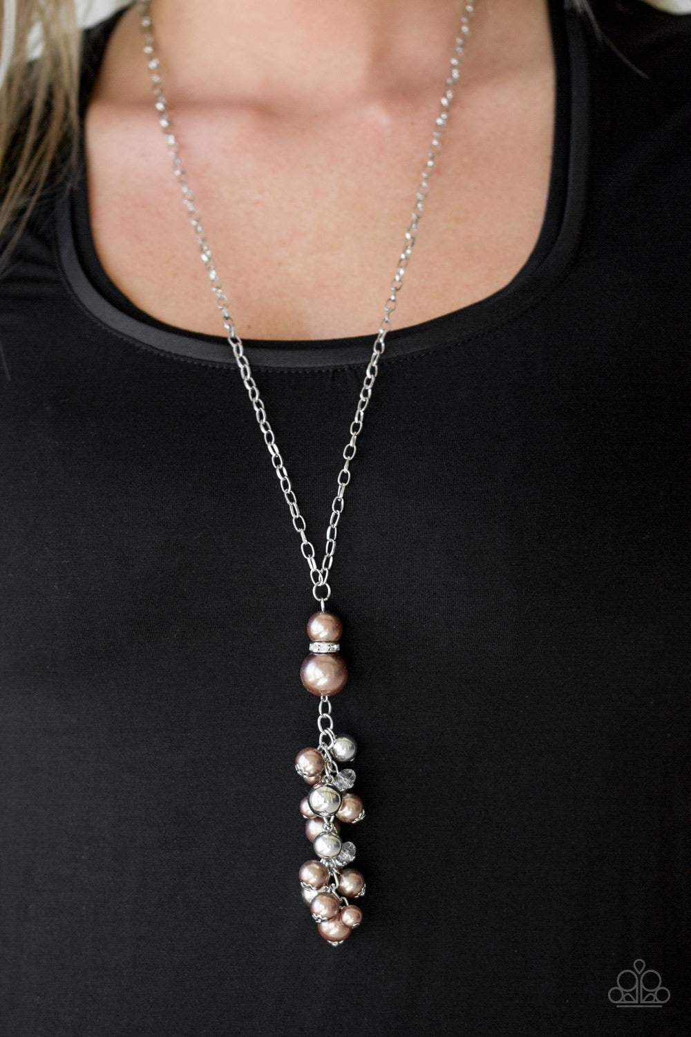 Infused with a rhinestone encrusted ring, a bubbly brown pearl pendant swings from the bottom of a shimmery silver chain. White crystal-like, shiny silver, and classic brown pearls cascade from the bottom of the pendant, creating a refined tassel. Features an adjustable clasp closure.