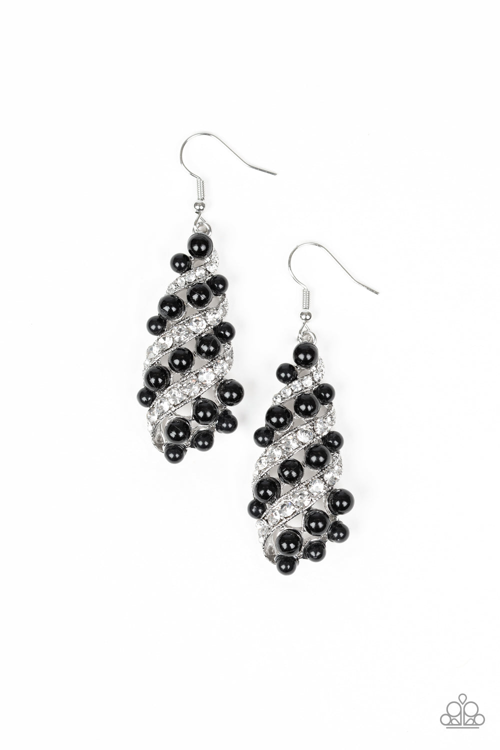 White rhinestone encrusted ribbons wrap around a shiny black beaded teardrop frame for a timeless look. Earring attaches to a standard fishhook fitting.