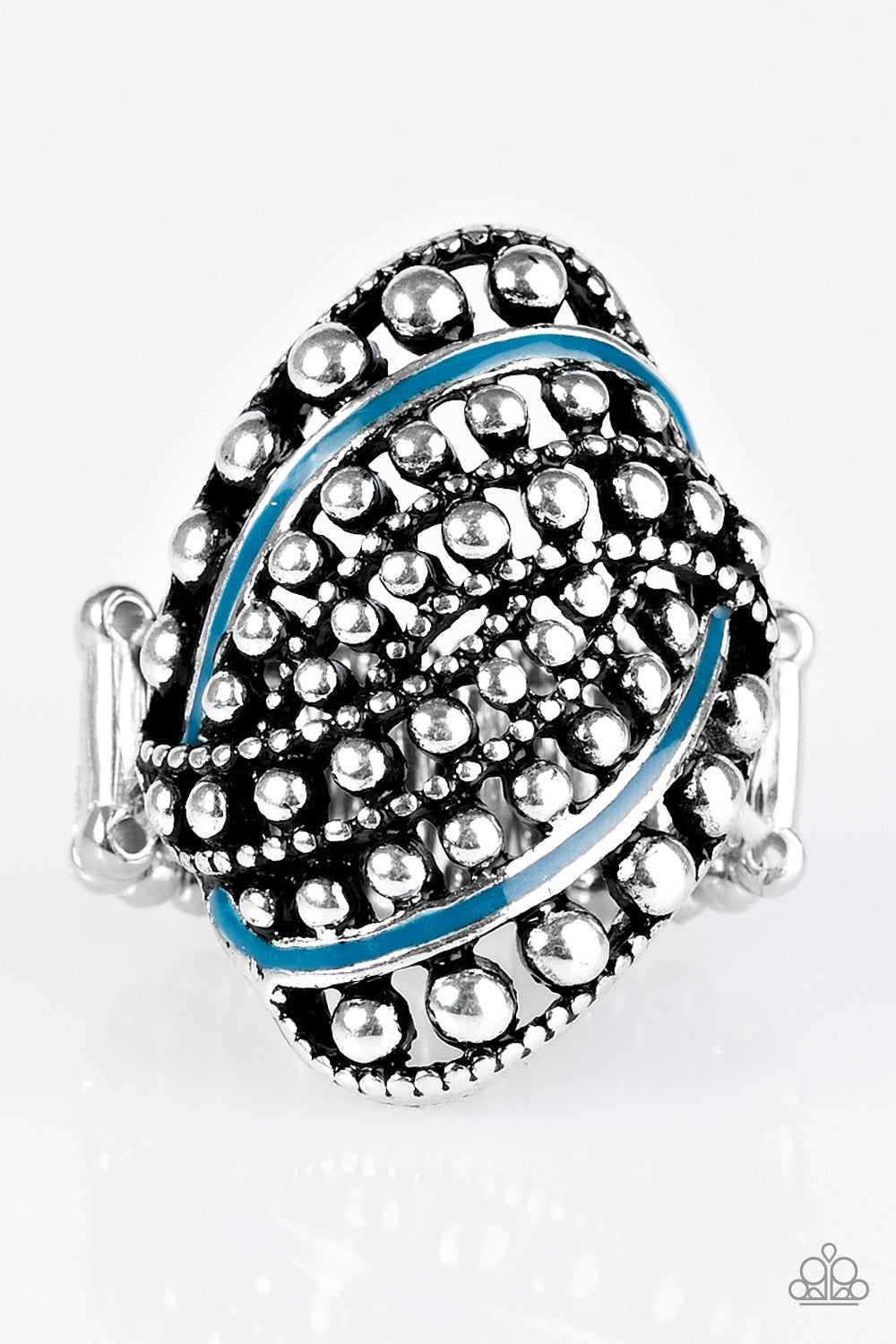 Varying in size and shimmer, shiny silver studs wrap around the finger, creating a bold industrial frame. Ribbons of blue weave between the glistening studs, adding bright splashes of color to the tribal dramatic frame. Features a stretchy band for a flexible fit.