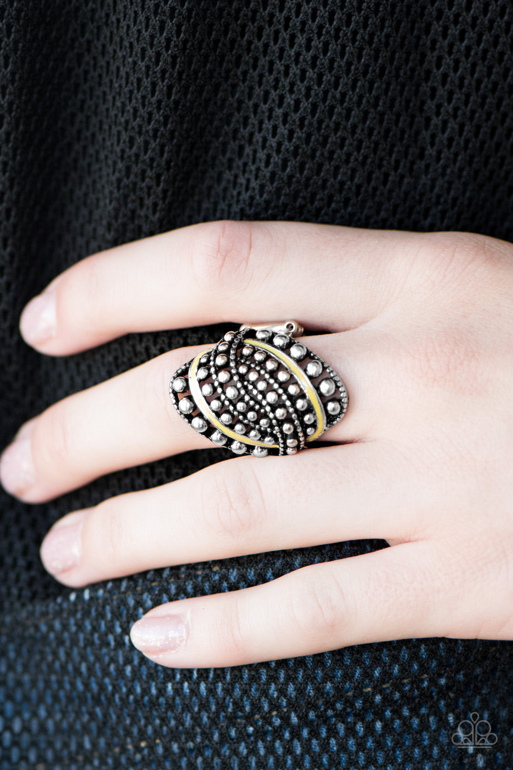 Varying in size and shimmer, shiny silver studs wrap around the finger, creating a bold industrial frame. Ribbons of yellow weave between the glistening studs, adding bright splashes of color to the tribal dramatic frame. Features a stretchy band for a flexible fit.